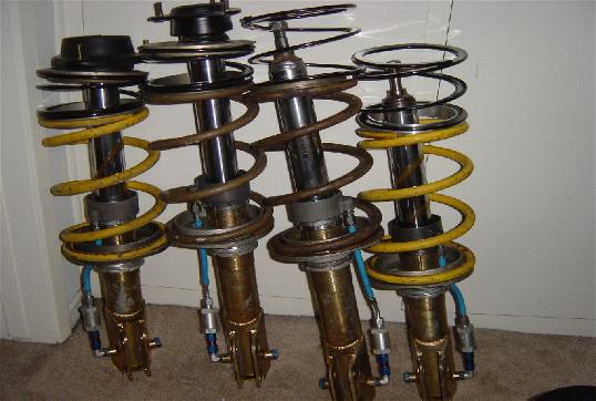 Prodrive/Bilstein 50mm GN Gravel Dampers for a GC8. Shocks have a built in oil circulating system that continually sprays oil on the upper bearing keeping the shock cool over long stages. Shocks have almost new GN Top mounts. The large diameter springs reduce flexing under load.